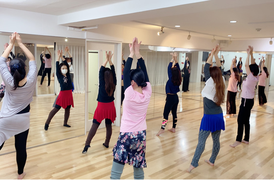 ストレッチの後はベリーダンスに必要な立ち方や目線、アームの位置などの基本姿勢を整えます。